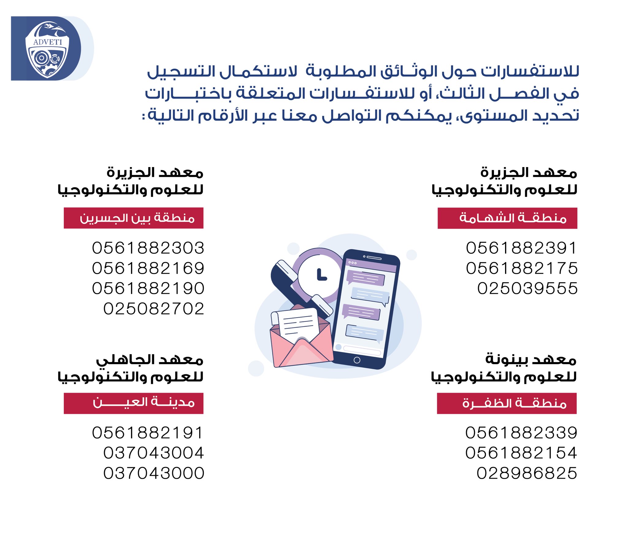 Adveti معهد أبوظبي Ar Twitter للتواصل مع المعاهد معهد الجزيرة للعلوم والتكنولوجيا أبوظبي 025082700 معهد الجزيرة للعلوم والتكنولوجيا الشهامة 025039555 معهد الجاهلي للعلوم والتكنولوجيا العين 037043000 معهد بينونة